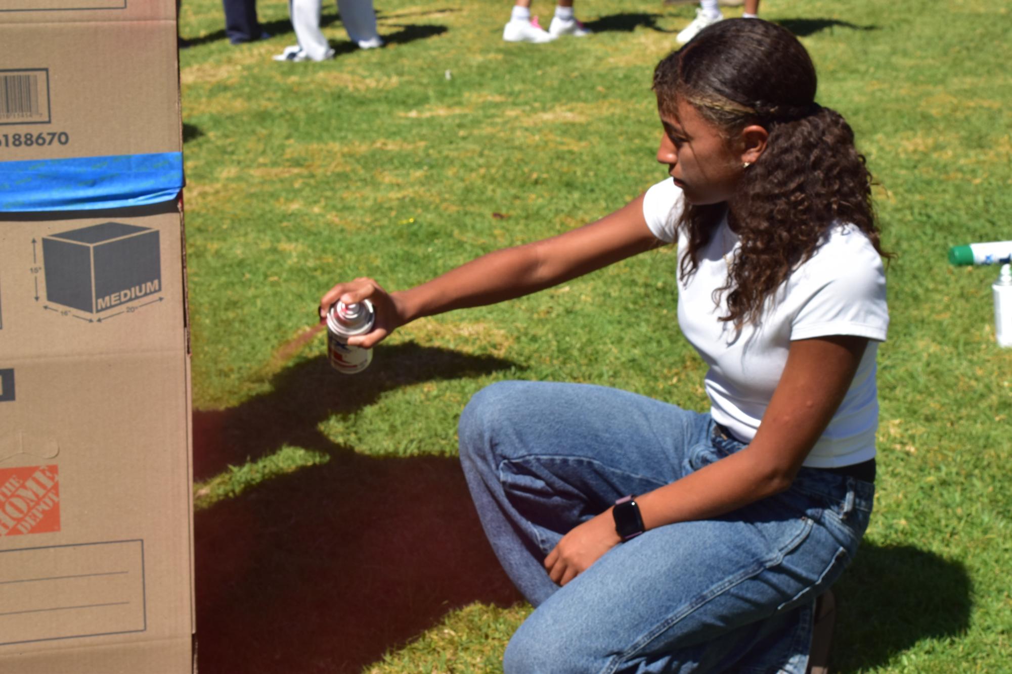 Associated Student Body member junior Annalise Glynn spray-paints stacked cardboard boxes in the quad on Thursday, Oct. 2, to create a red-and-blue pillar for the homecoming class theme reveal.