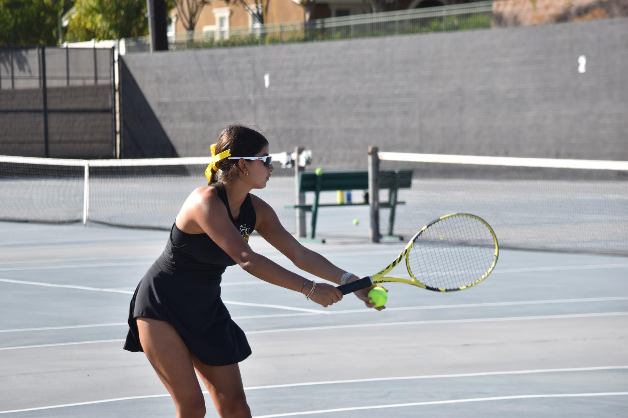 Varsity girls tennis player sophomore Vannia Pacheco serves against her opponent from Foothill High School during a home match on Tuesday, Sept. 30, on the tennis courts after school.
