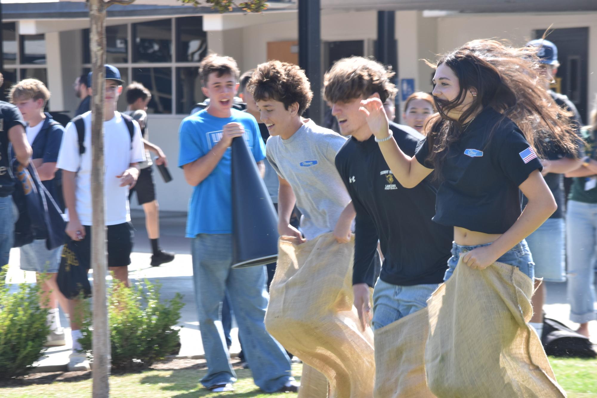 Freshman Blake Lamping (left), senior Joshua Stewart and senior Lucy Lamping hop in a potato sack race hosted by Link Crew during break on Wednesday, Oct. 1, in the quad. Stewart won, followed by Blake Lamping and Lucy Lamping.