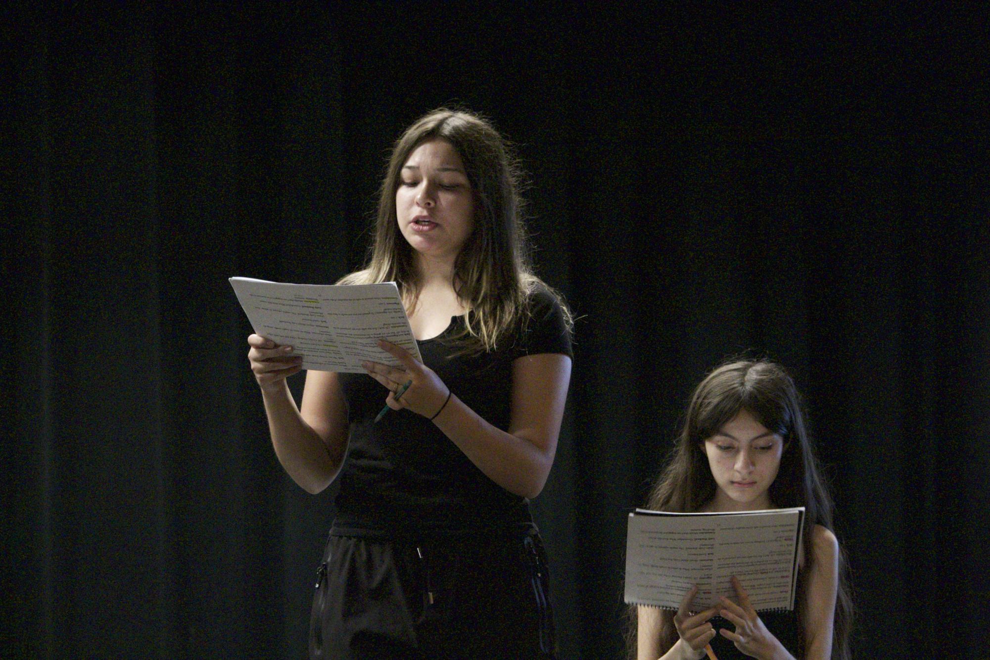 Senior Aimee Rivera (left) and sophomore Olivia Olsson recite their lines during the Lancer Theatre Company’s fall play, The Importance of Being Earnest, rehearsal on Thursday, Oct. 2, in the Performing Arts Center.