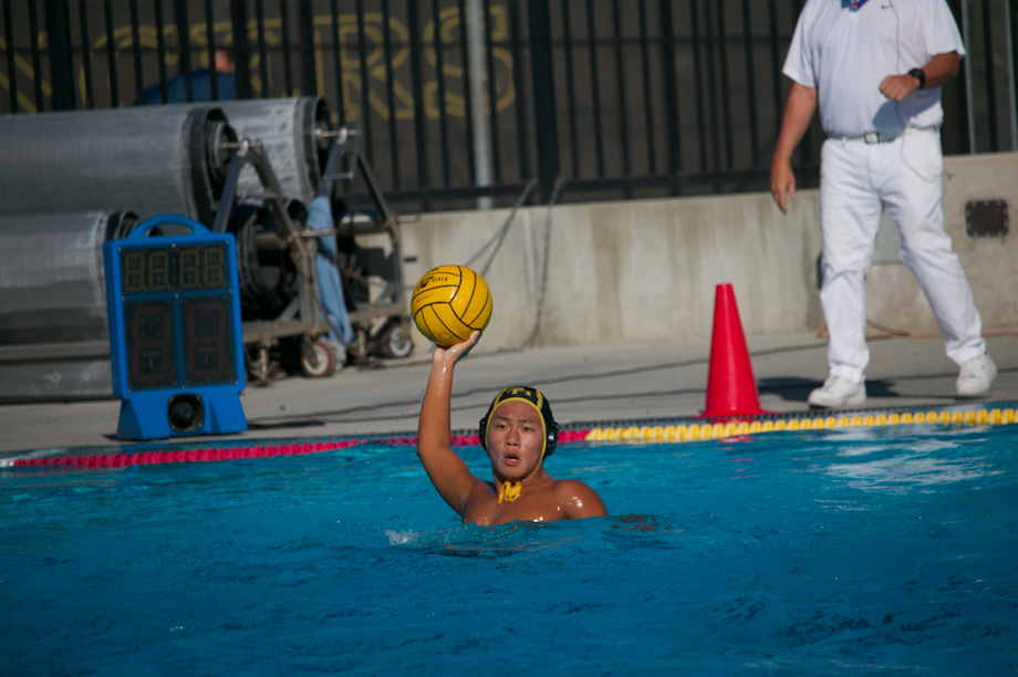Varsity boys water polo player sophomore William Ryoo prepares to throw the ball during a home game against El Modena High School on Tuesday, Sept. 30, in the pool. Sunny Hills won with a final score of 11-10.