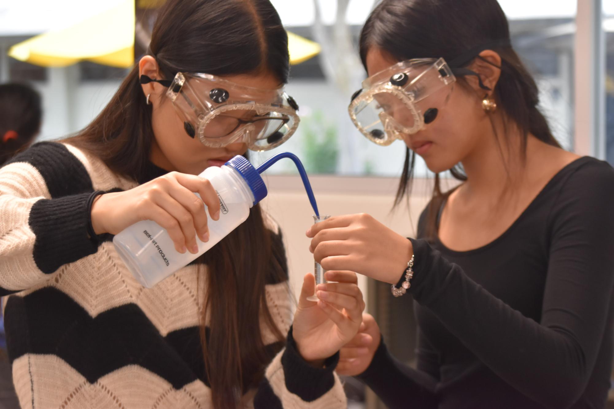 Sophomore Gloria Paik pours water into a graduated cylinder while her partner sophomore Olive Yoon holds it upright during a lab to measure the reactivity of elements for their Chemistry Honors class in Room 115 on Wednesday, Oct. 8.