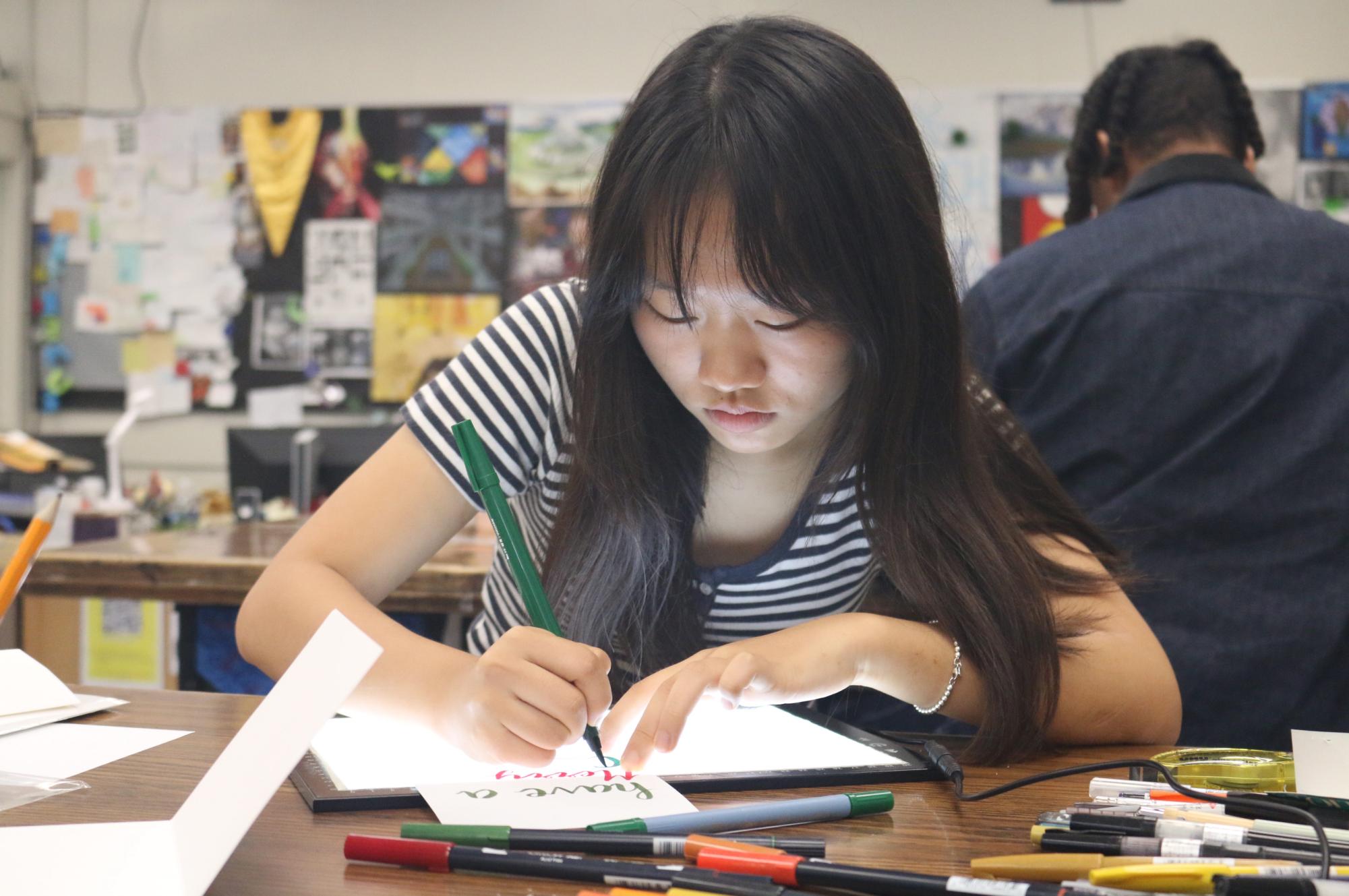 Junior Eileen Chung uses a green brush pen to create a Christmas card during the calligraphy workshop after school on Friday, Oct 10, in Room 137.