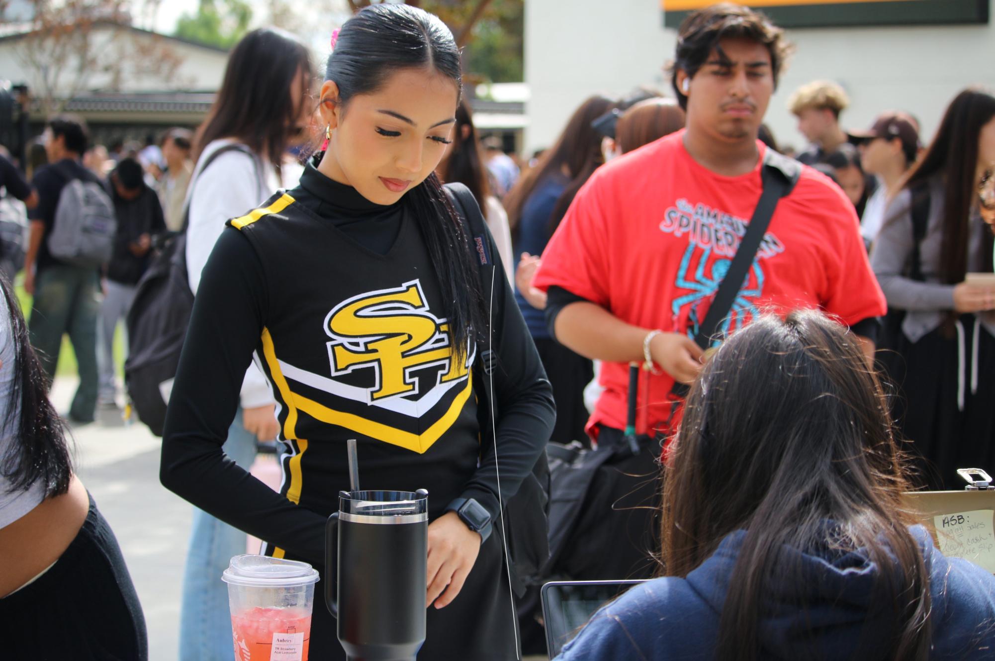 Cheerleader junior Aubrey Sanchez purchases a ticket to homecoming after performing in the pep rally at break on Friday, Oct. 10, in the quad.