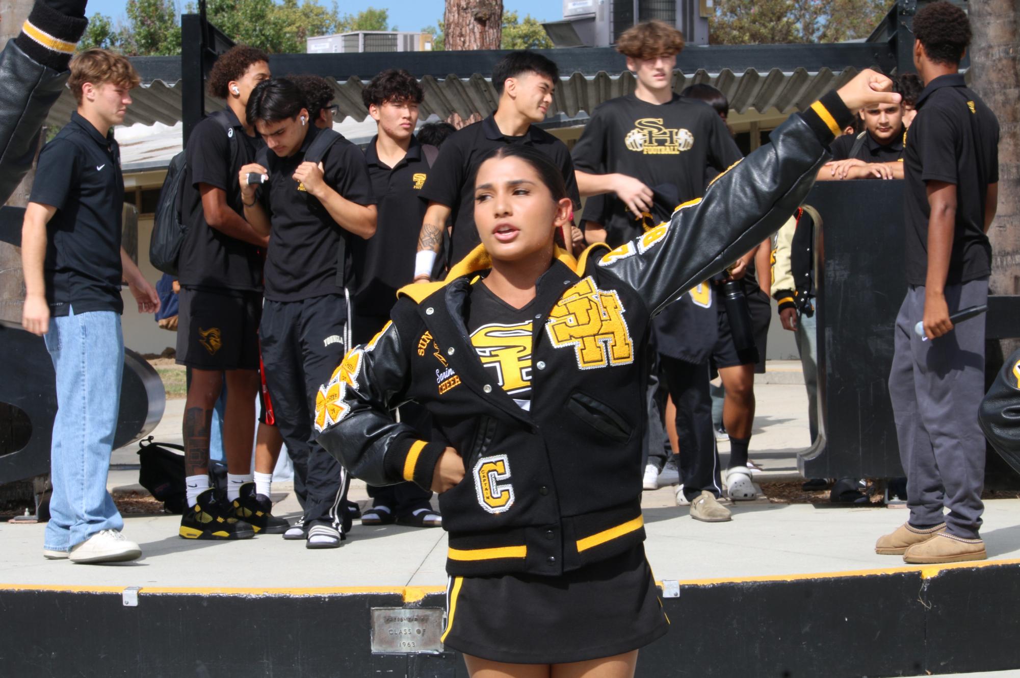 Varsity cheer captain junior Sarina Desai puts one hand on her hip and raises the other during the final cheer of the pep rally at break on Friday, Oct. 10, in the quad.