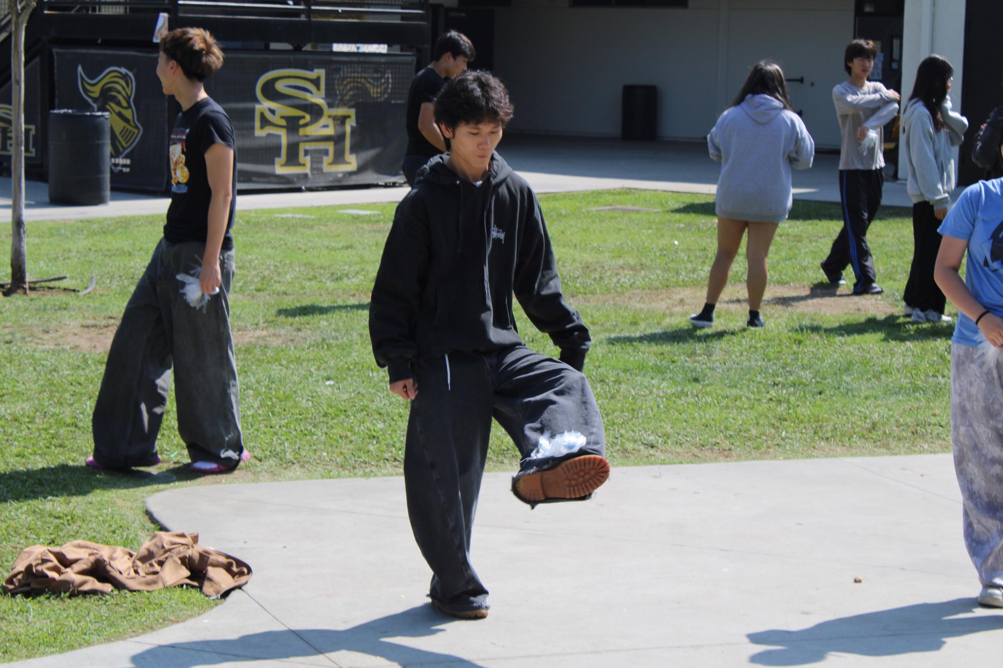 Junior Timothy Roh kicks a jegi, a shuttlecock used for Korean folk games, as he tries to keep it in the air as long as possible for his Korean 3 class during the fourth period on Wednesday, Oct. 8, in the quad.